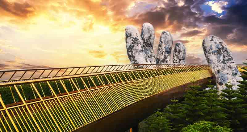 Experience the feeling of walking in the clouds when you walk on the Golden Bridge, which seems to be supported by a pair of giant hands jutting out of the mountain.