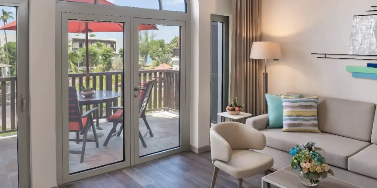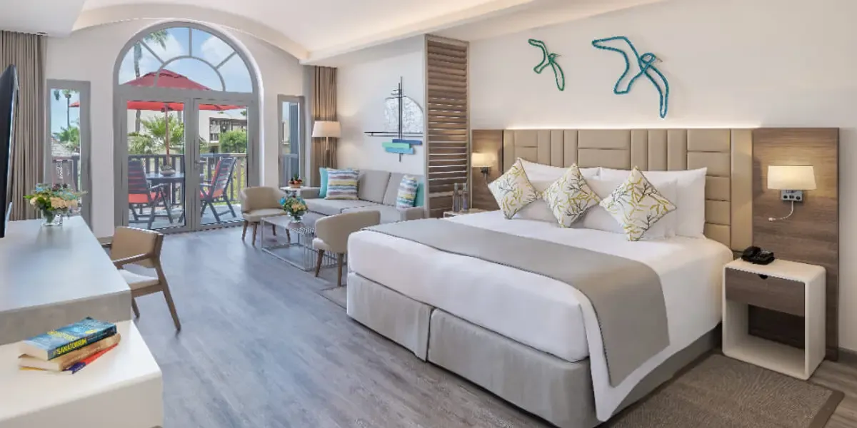 Enjoy a tranquil beachfront escape at JA Palm Tree Court, with its peaceful setting and family-friendly vibe. Stay in a comfortable Garden View Junior Suite designed for a relaxing family getaway. The suite overlooks lush gardens and provides spacious interiors, ideal for 2 adults and 1 child (up to 5 years old). With peaceful surroundings and resort amenities, it is perfect for a calm and enjoyable Dubai staycation. Book with Travelwings today!