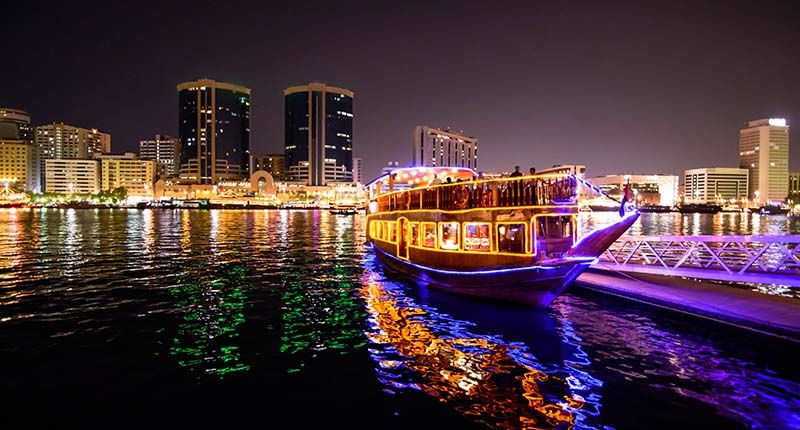 • (En option) Le soir, Diner croisière à bord du bateau traditionnel « Dhow » pour découvrir l’autre cote de Dubaï. Là vous pouvez voir le contraste entre Dubaï l’ancienne ville et Ira moderne