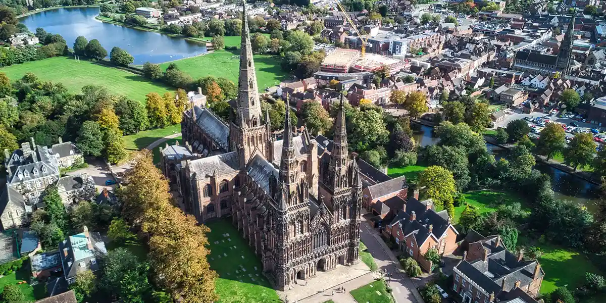 Stop in Lichfield, a charming town known for its unique three-spired cathedral and picturesque historic center.
