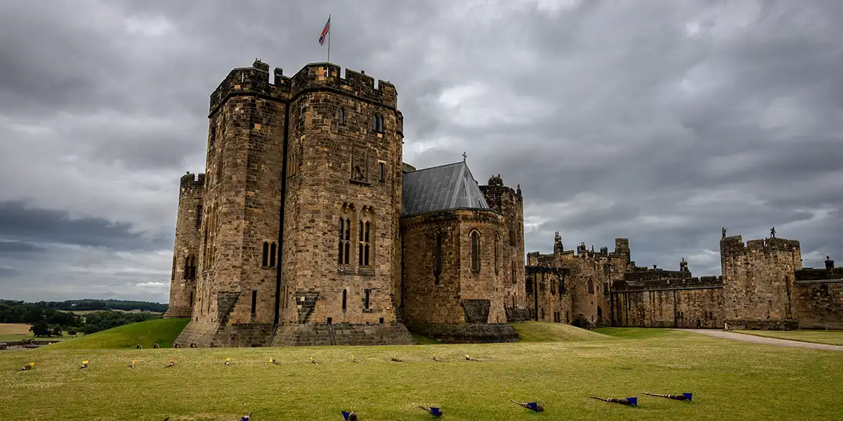 Travel north into Scotland, stopping in Alnwick, a picturesque town known for its beautiful gardens and medieval castle, famously featured in the Harry Potter films.